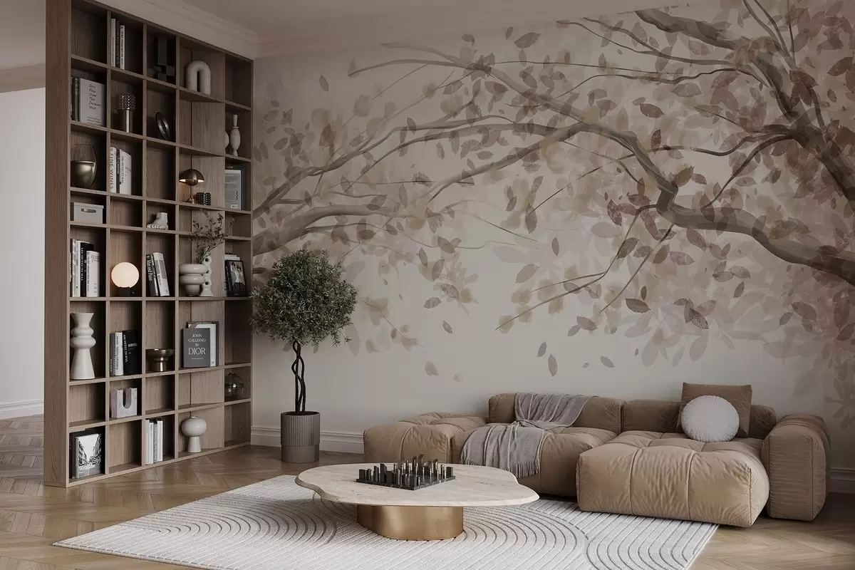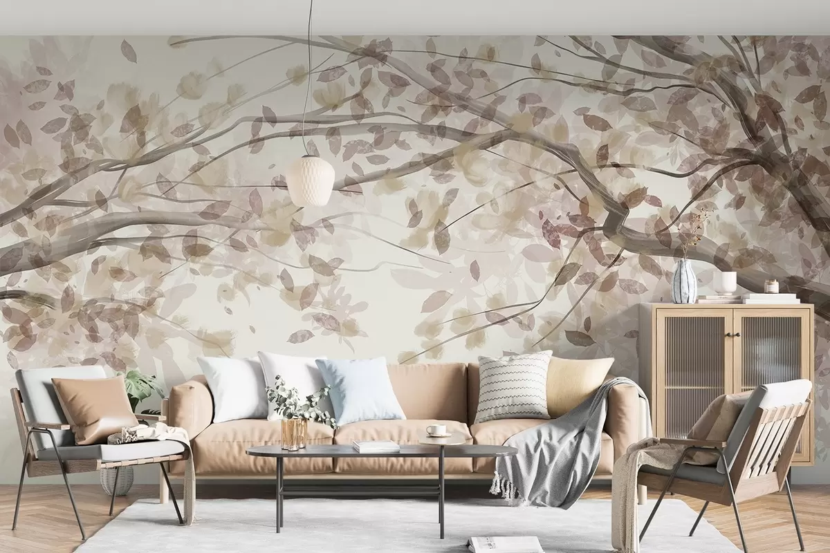 Carta da parati Rami di fiori con foglie beige, colori tenui, dettagli delicati, stile acquerello, su sfondo chiaro nr. w08867v1