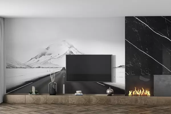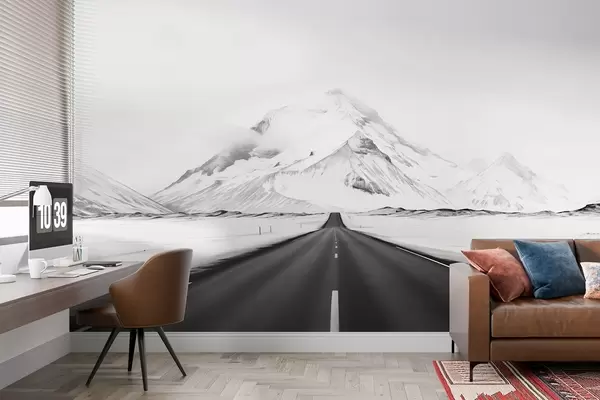 Carta da parati Un paesaggio in bianco e nero con una strada che conduce alle montagne con una leggera foschia nr. w08876