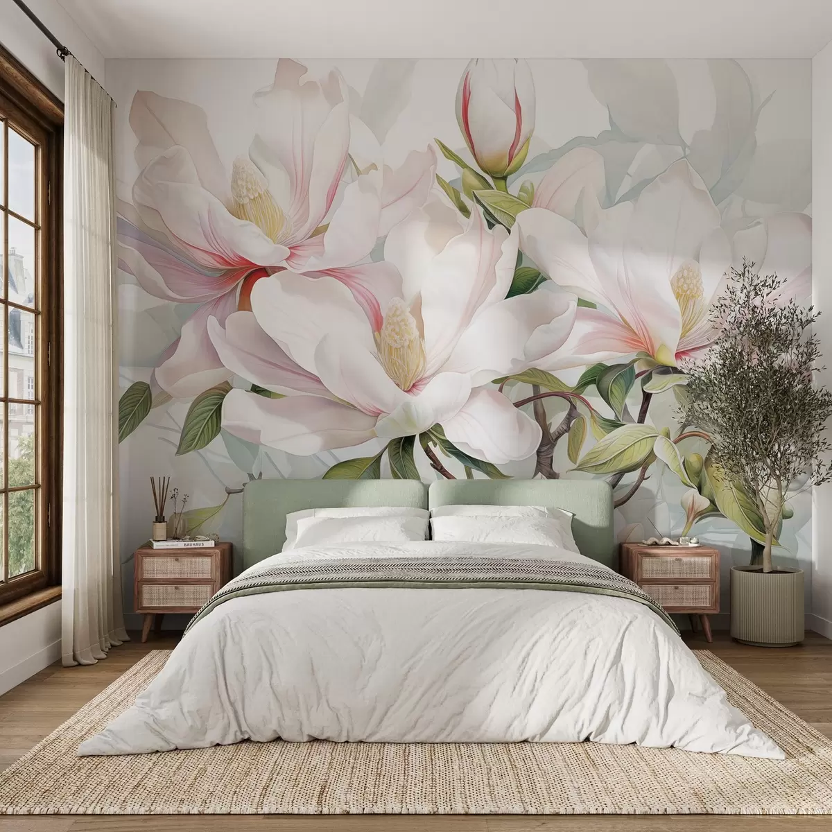 Carta da parati Fiori di magnolia con petali bianchi e rosa, foglie e rami marroni, stile acquerello morbido e delicato nr. w08885