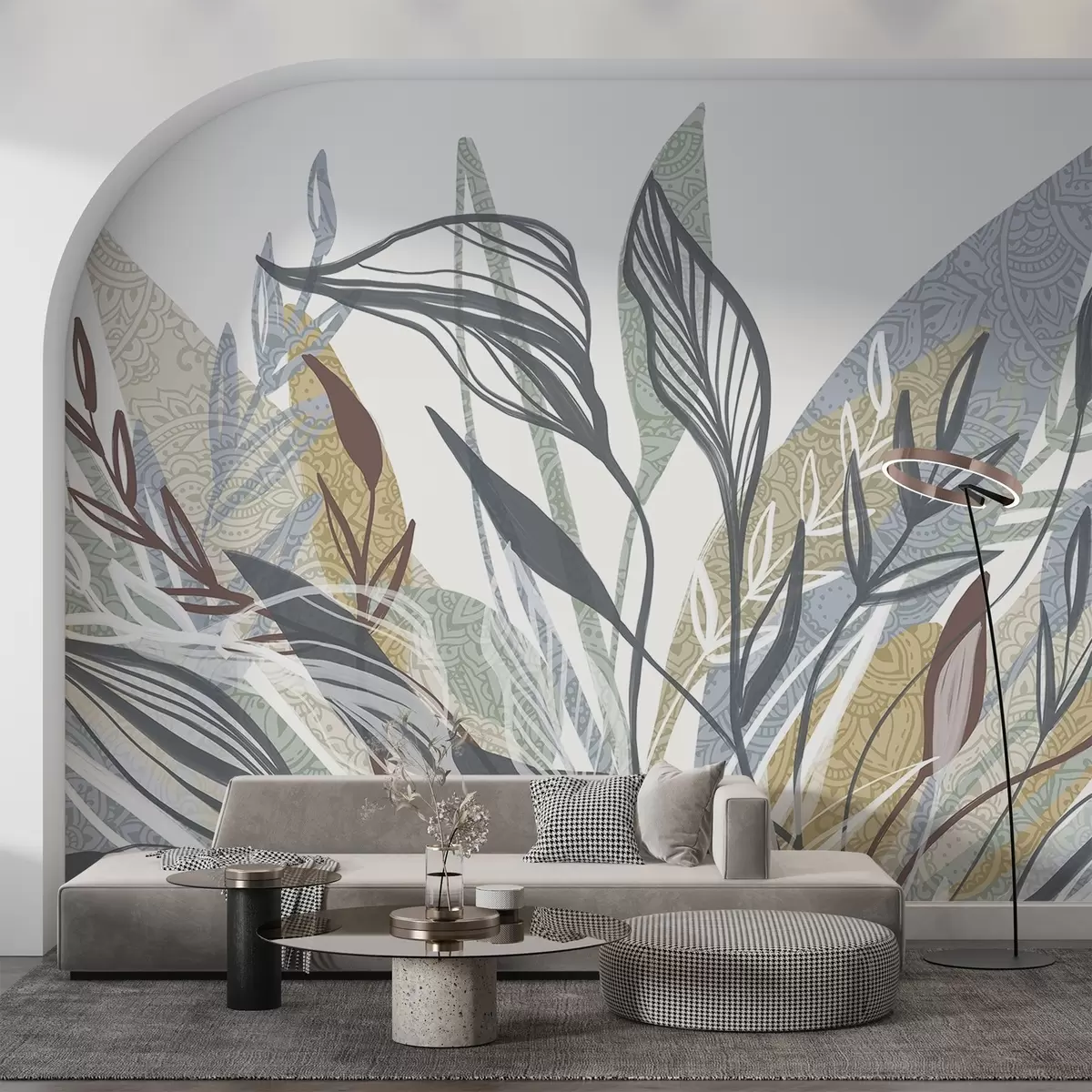 Carta da parati Una collezione di foglie di diversi colori e dimensioni, alcune con disegni al tratto, su uno sfondo bianco nr. w08893