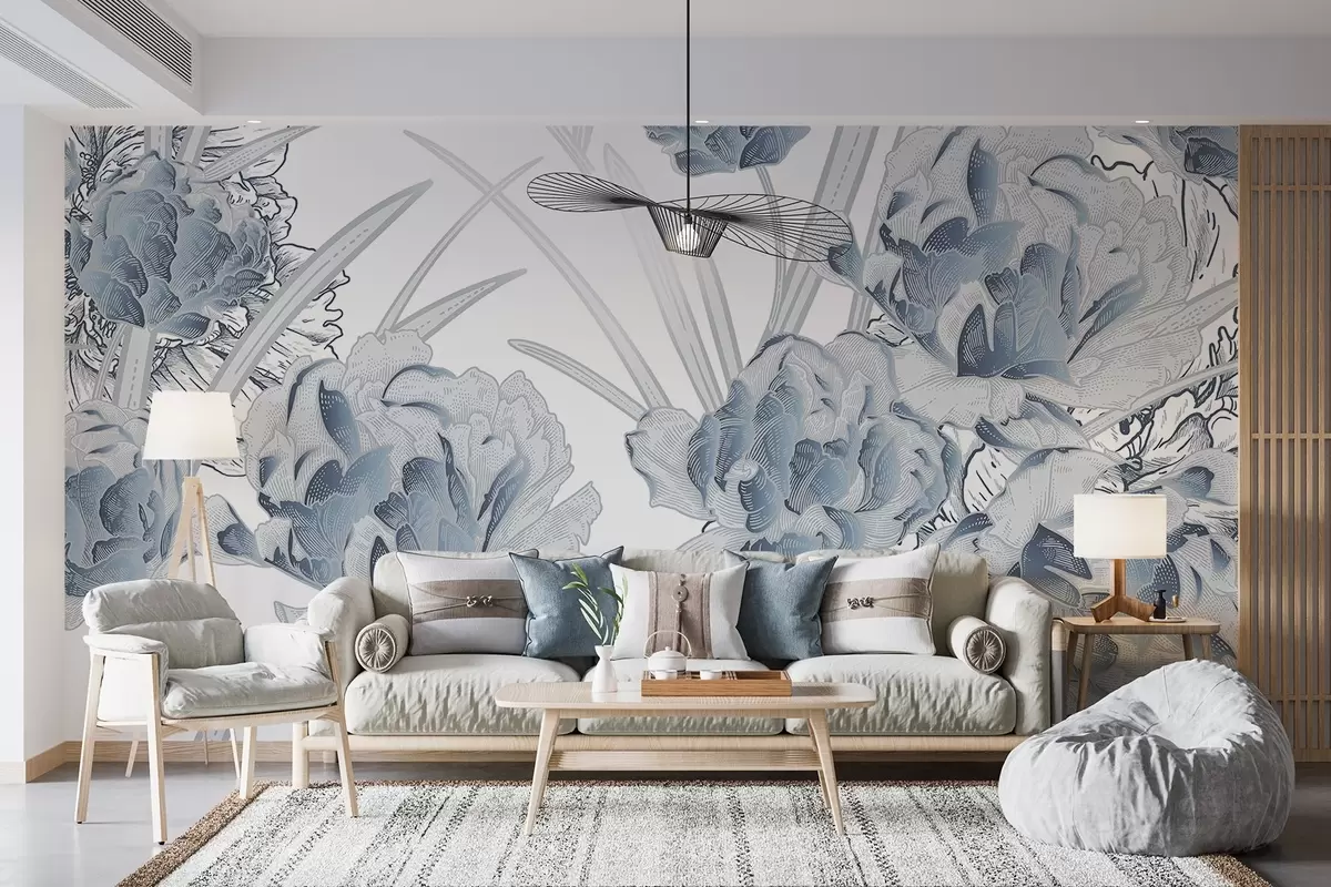 Carta da parati Peonie blu con foglie su sfondo bianco, disegno floreale, illustrazione botanica nr. w08896
