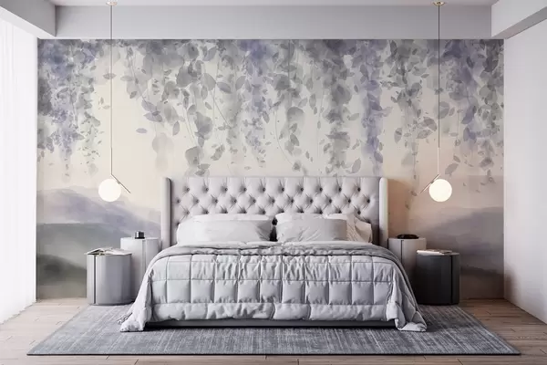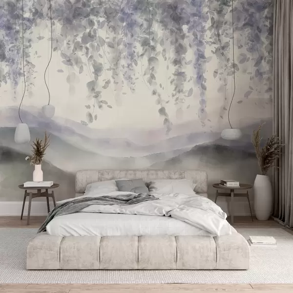 Carta da parati Foglie di glicine che pendono sulle montagne colorate, tenui colori pastello blu e grigi, paesaggio in stile acquerello nr. w08909