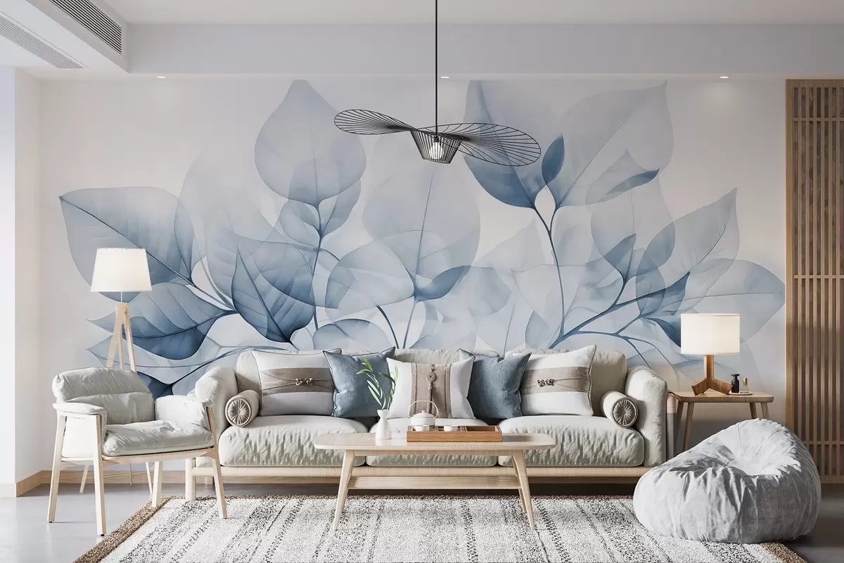 Carta da parati Pittura ad acquerello di foglie traslucide in colori pastello, con sfumature di bianco e blu nr. w08910v1