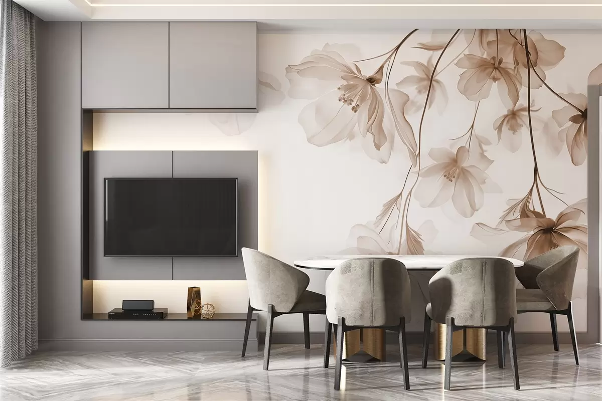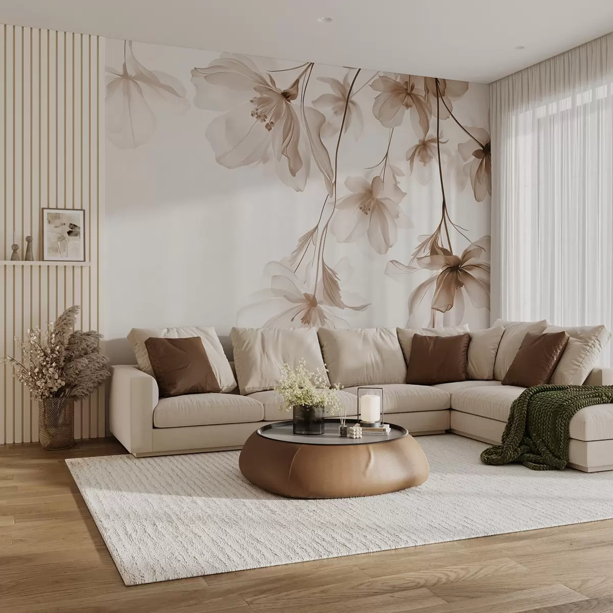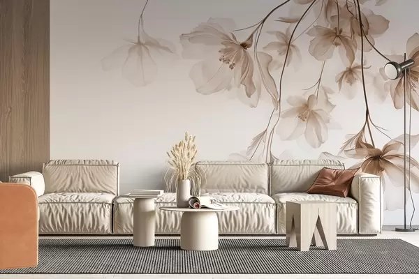 Carta da parati Fiori beige con petali traslucidi appesi a un ramo, beige e bianco, composizione d'arte moderna minimalista nr. w08911v1