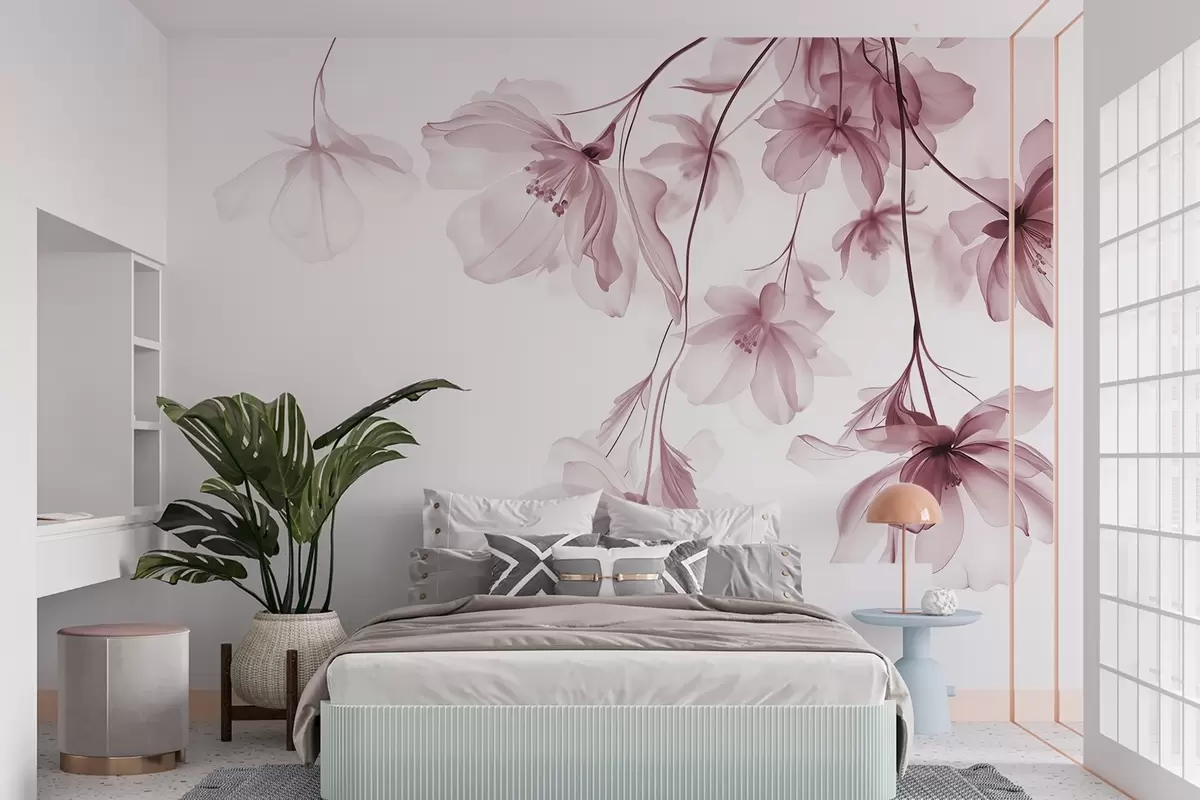 Carta da parati Fiori rosa con petali traslucidi appesi a un ramo, rosa e bianco, composizione d'arte moderna minimalista nr. w08911v2