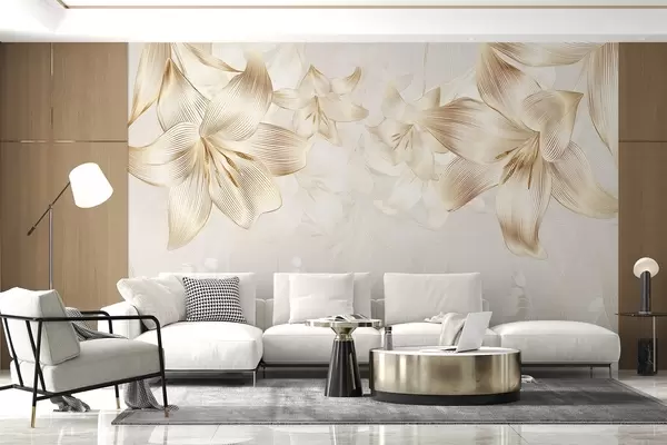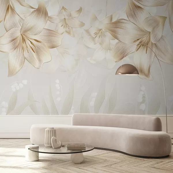 Carta da parati Gigli gialli con dettagli di linee intricate, composizione floreale elegante, tavolozza di colori neutri nr. w08912