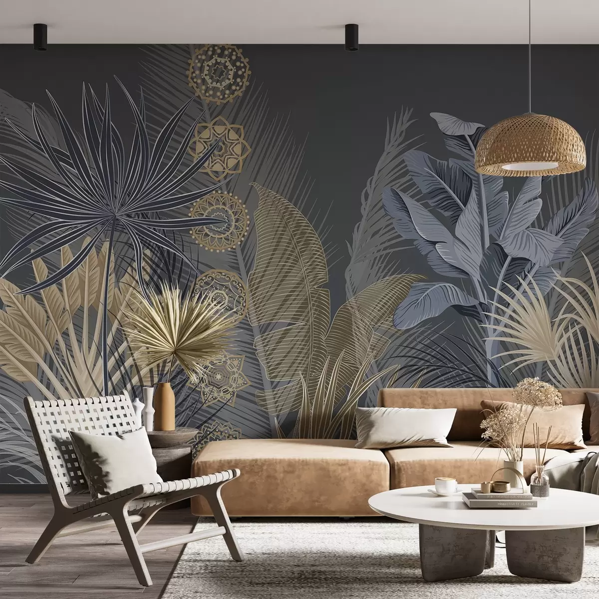 Carta da parati Foglie tropicali nei toni del blu e del marrone, foglie di palma, foglie di banano e ornamenti mandala, sfondo scuro nr. w08913