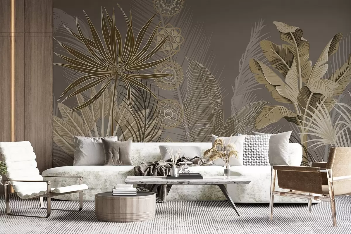 Carta da parati Foglie tropicali nei toni del beige e del marrone, foglie di palma, foglie di banano e ornamenti mandala, sfondo scuro nr. w08913v1