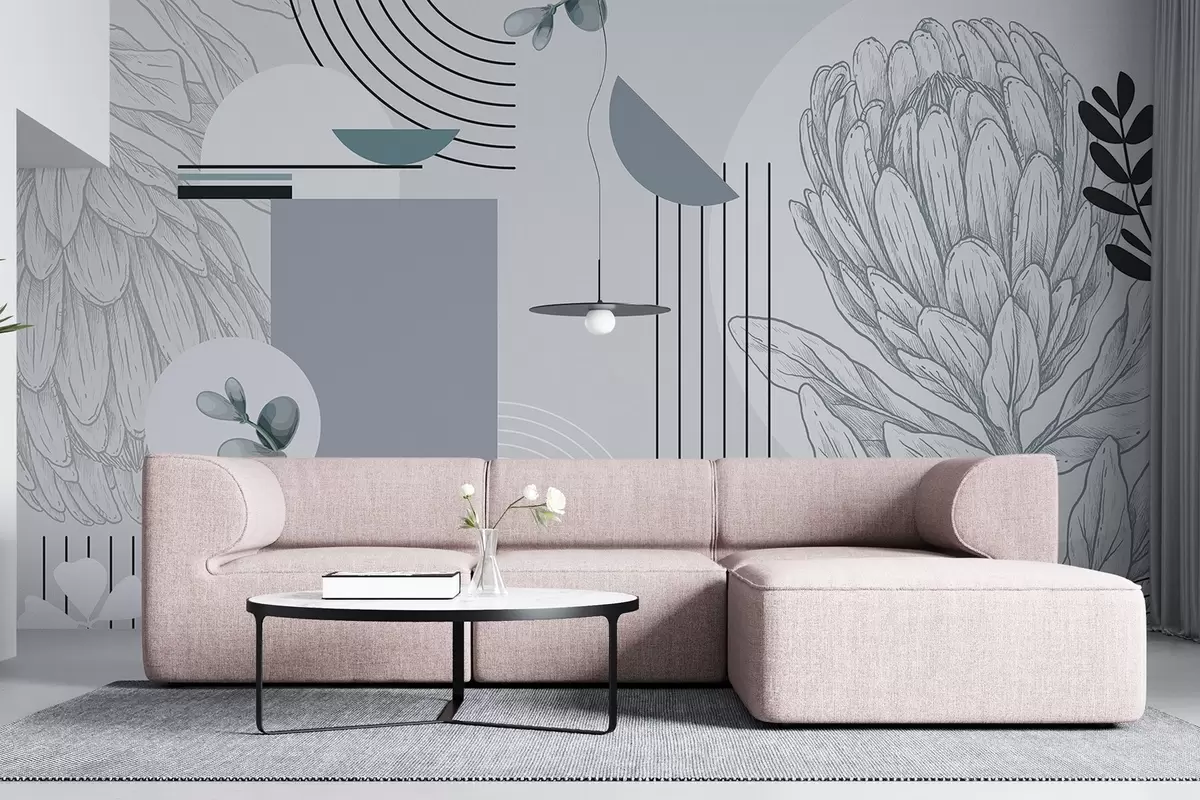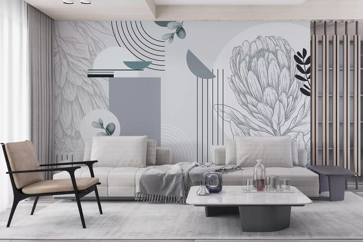 Carta da parati Stampa botanica astratta con fiore di protea, foglie di eucalipto, forme geometriche in stile minimalista, colori pastello nr. w08914v1
