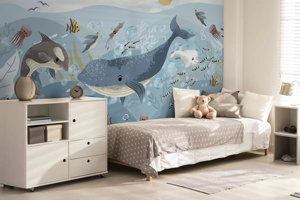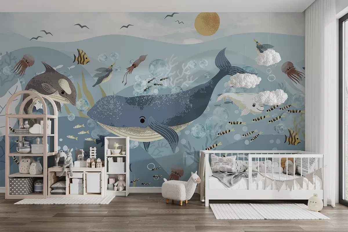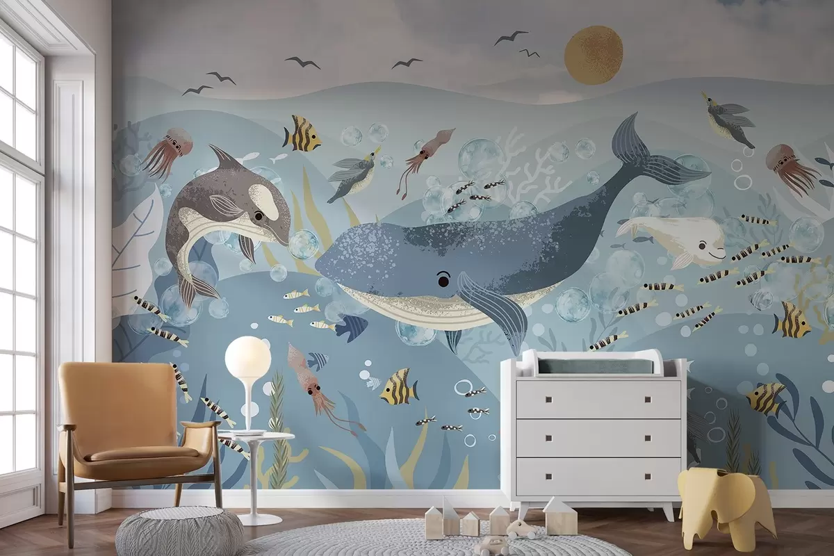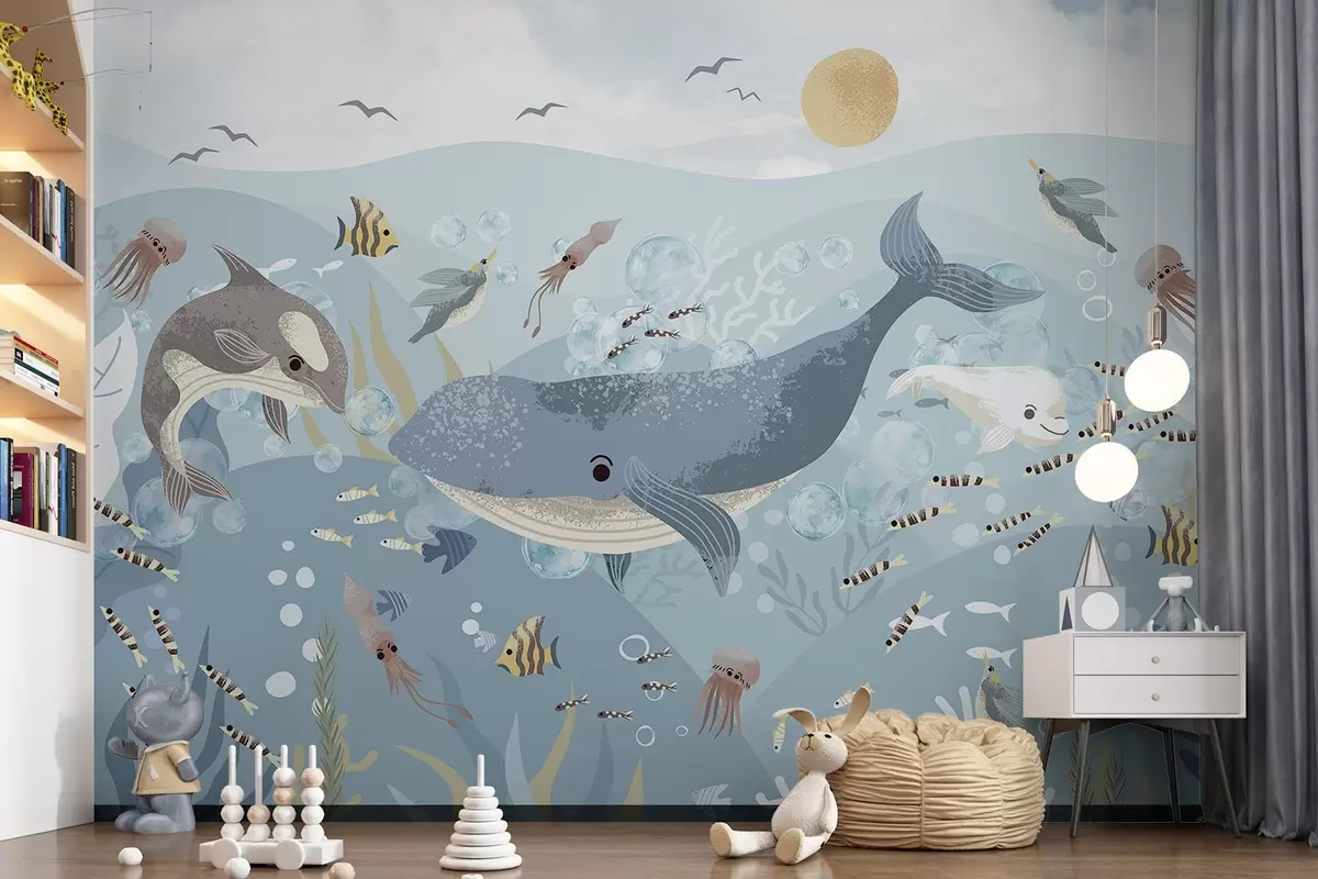 Carta da parati Illustrazione per bambini con una simpatica stampa di una balena blu circondata da pesci, calamari e meduse in un oceano blu con bolle di sapone nr. w08921