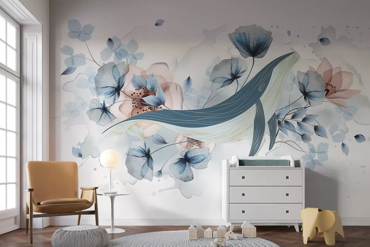 Carta da parati Balena blu con fiori, stile acquerello, colori blu chiaro e rosa, sfondo chiaro nr. w08922