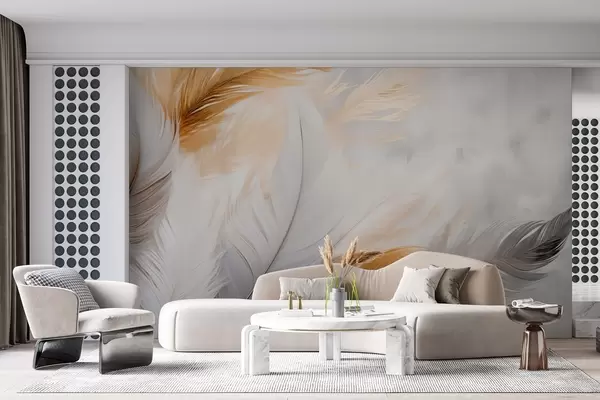 Carta da parati Piume grigie e gialle su sfondo grigio nr. w08937