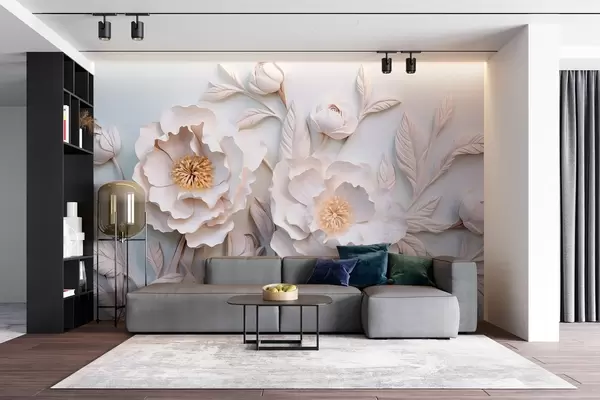 Carta da parati peonie in rilievo 3D in stile affresco con accento giallo nr. w08967