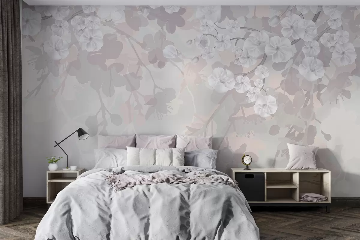 Carta da parati Rami di fiori di ciliegio con fiori bianchi e foglie grigie, su eleganti sagome floreali in tenui colori pastello nr. w08973v1