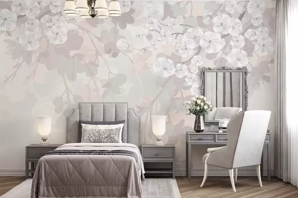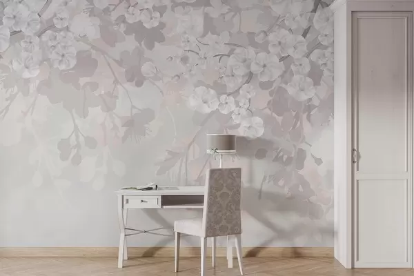 Carta da parati Rami di fiori di ciliegio con fiori bianchi e foglie grigie, su eleganti sagome floreali in tenui colori pastello nr. w08973v1