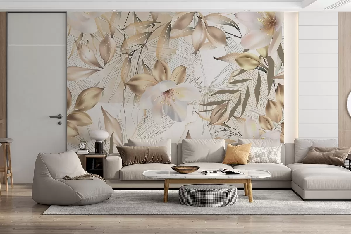 Carta da parati Fiori e foglie di gelsomino, colori tenui, illustrazione botanica, sfondo floreale, design elegante, petali delicati nr. w08977
