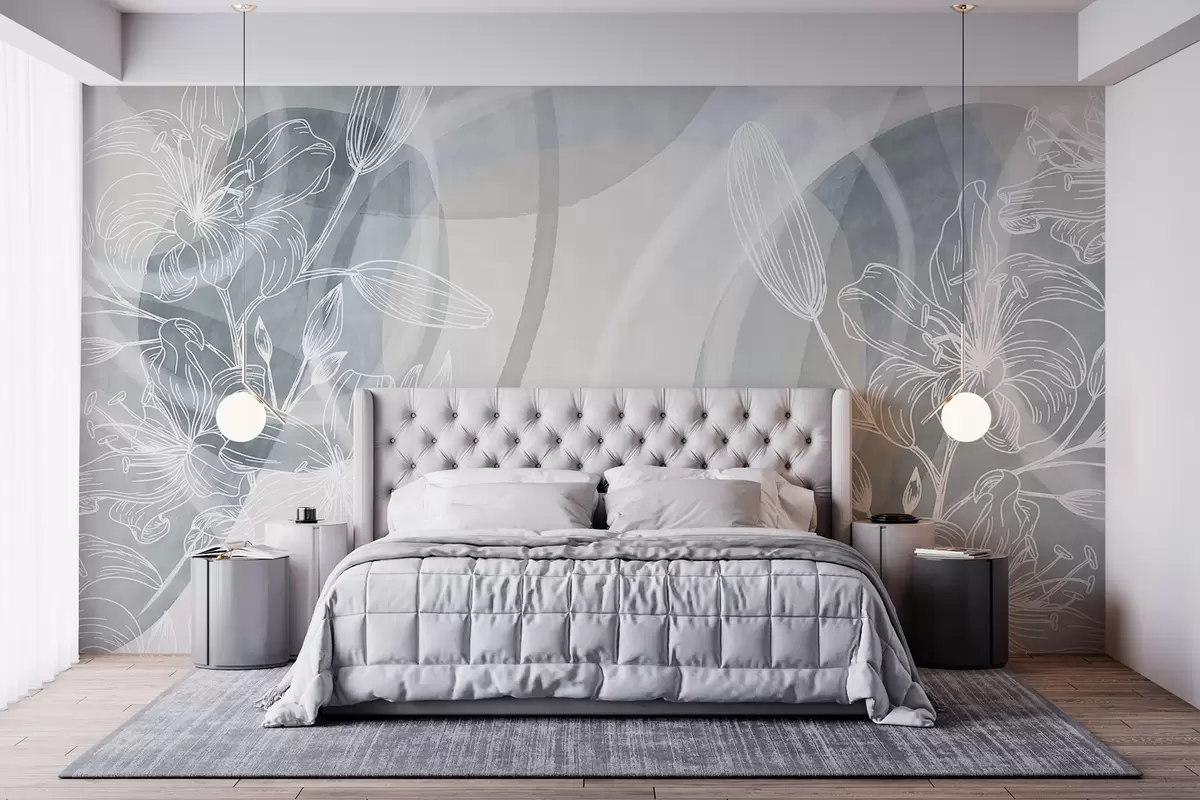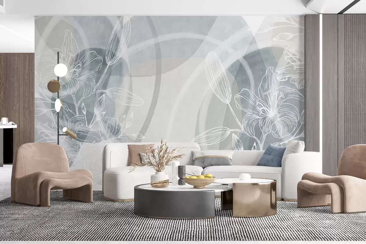 Carta da parati Design floreale minimalista con fiori e foglie line art bianche, cerchi astratti sovrapposti nei toni del grigio e del blu nr. w08979