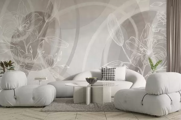 Carta da parati Design floreale minimalista con fiori e foglie line art bianche, cerchi astratti sovrapposti nei toni del beige e del blu nr. w08979v1