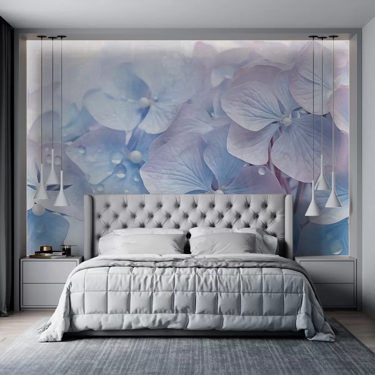 Carta da parati Fiori di ortensia vintage testurizzati blu e rosa con gocce d'acqua sui petali, sfondo rosa sfocato nr. w08981