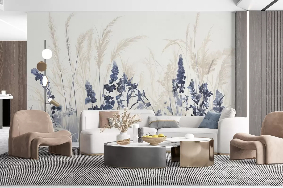 Carta da parati Fiori blu e canne beige in un campo, texture pittorica minimalista, sfondo chiaro, colori tenui, pennellate delicate nr. w08982