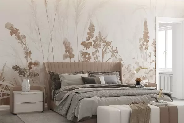 Carta da parati Fiori marroni e canne beige in un campo, texture pittorica minimalista, sfondo chiaro, colori tenui, pennellate delicate nr. w08982v1