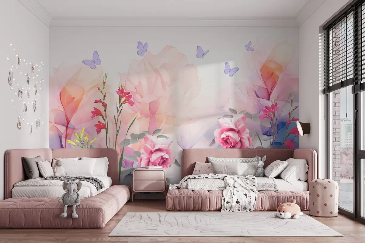 Carta da parati Fiori con farfalle e rose in stile acquerello nr. w09002