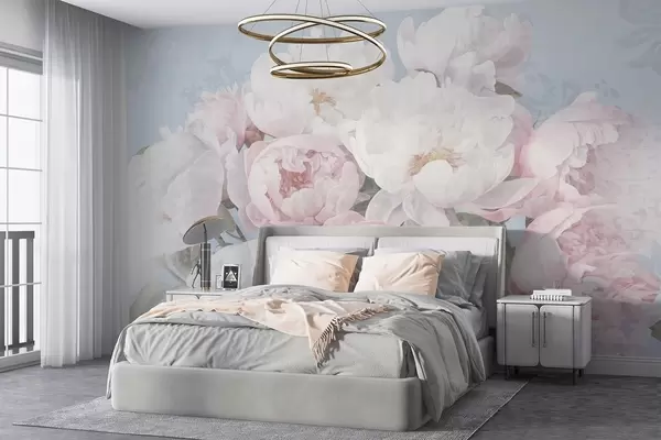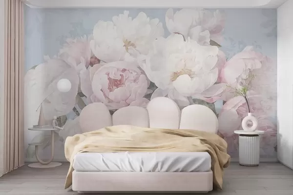 Carta da parati Peonie rosa e bianche astratte e strutturate con foglie verdi, sfondo azzurro, colori tenui e delicati, stile vintage nr. w09008