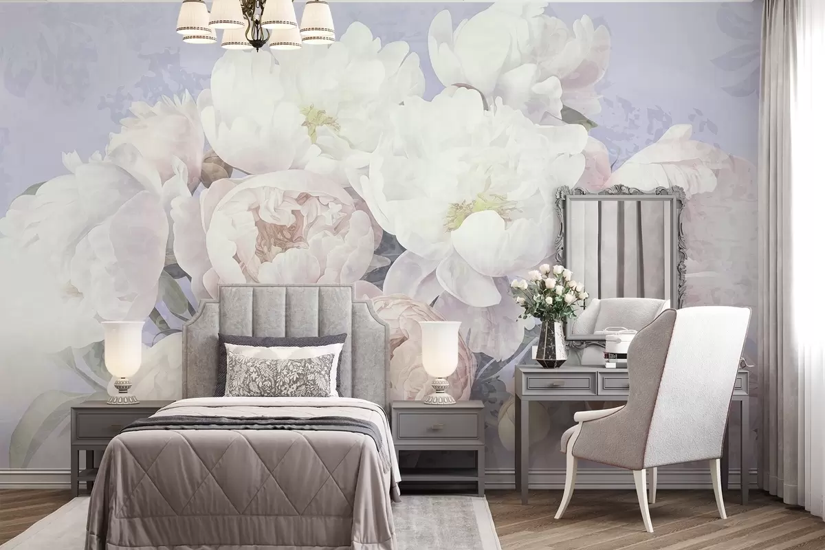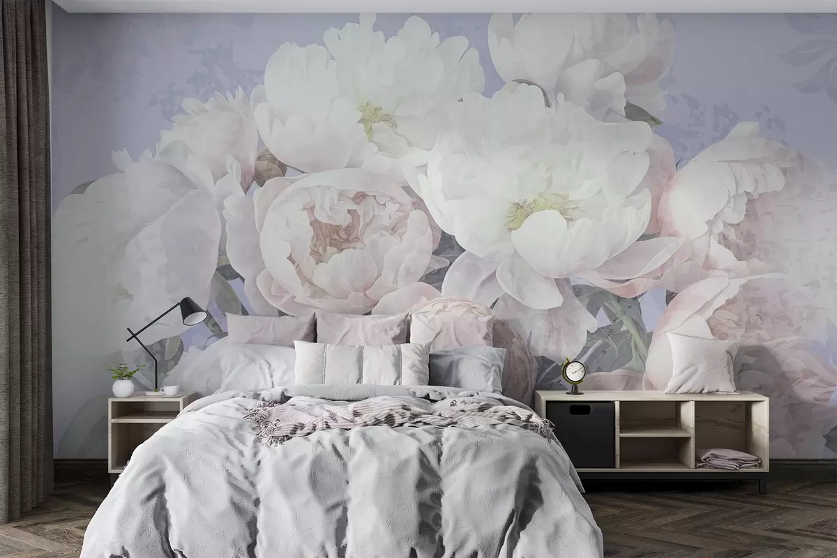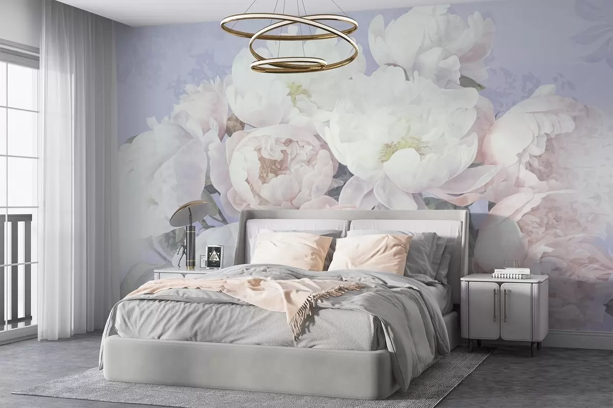 Carta da parati Peonie astratte color pesca e bianche con foglie verdi, sfondo chiaro, colori tenui e delicati, stile vintage nr. w09008v1