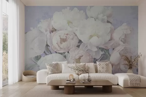 Carta da parati Peonie astratte color pesca e bianche con foglie verdi, sfondo chiaro, colori tenui e delicati, stile vintage nr. w09008v1