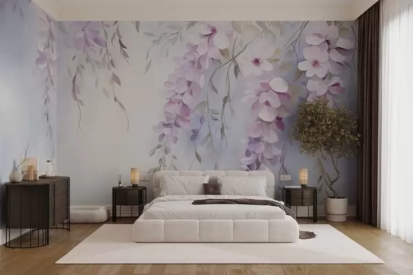 Carta da parati Fiori di glicine con petali lilla e foglie verdi che pendono dai rami, colori pastello tenui, sfondo color pastello nr. w09010