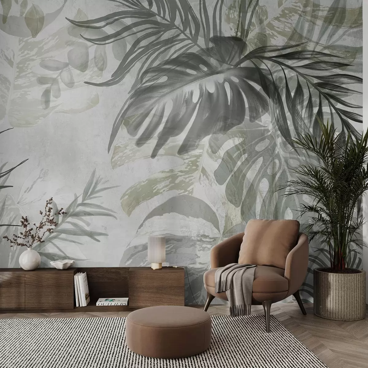 Carta da parati Monstera e foglie di palma nei toni del verde e del grigio, botanica, fogliame tropicale, piante della giungla, sfondo strutturato nr. w09011