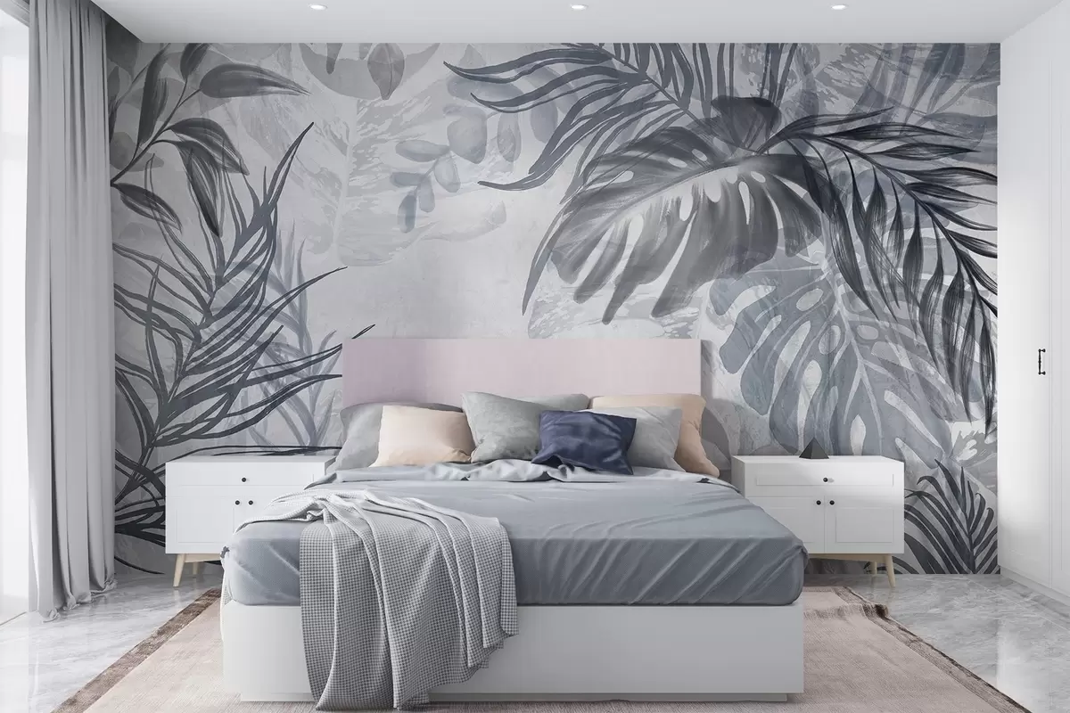 Carta da parati Monstera e foglie di palma nei toni del blu e del grigio, botanica, fogliame tropicale, piante della giungla, sfondo strutturato nr. w09011v1