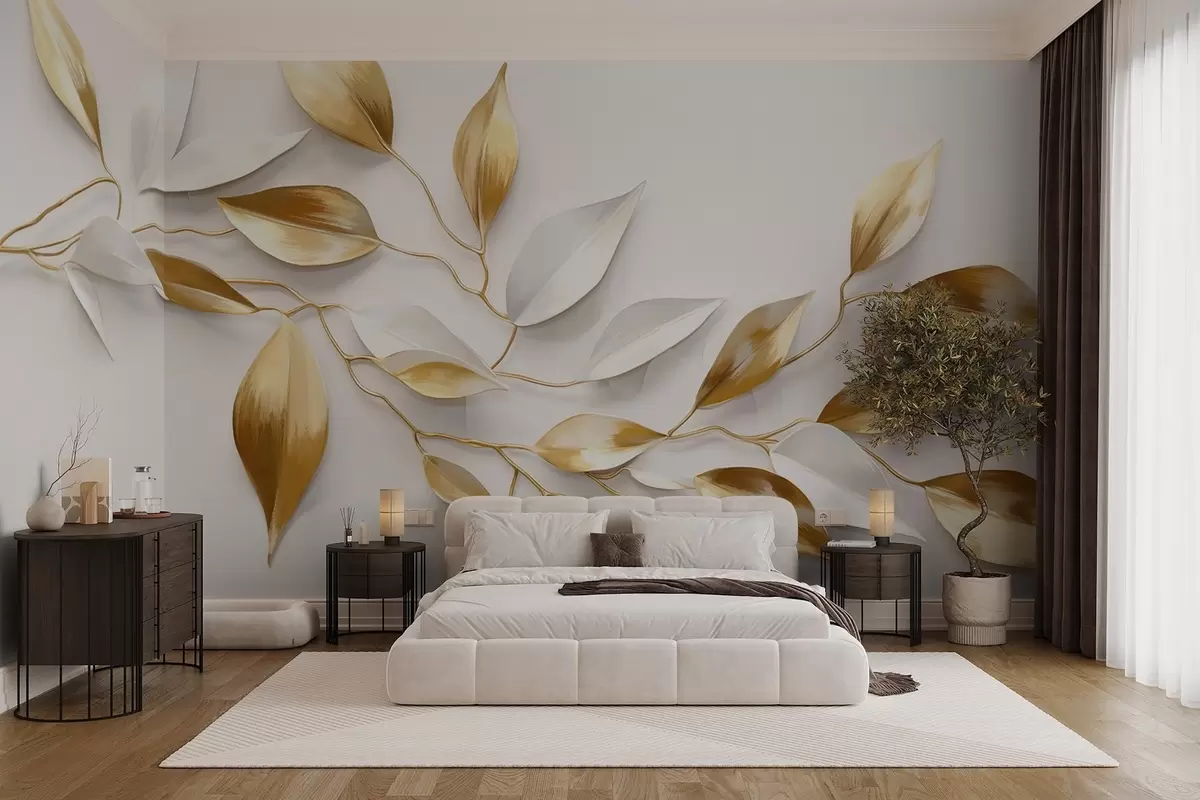 Carta da parati Foglie gialle e bianche su un ramo , design elegante, sfondo bianco, stile minimalista, arte decorativa, ispirato alla natura nr. w09015