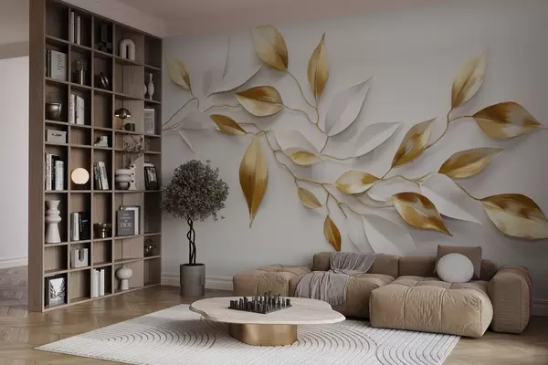 Carta da parati Foglie gialle e bianche su un ramo , design elegante, sfondo bianco, stile minimalista, arte decorativa, ispirato alla natura nr. w09015