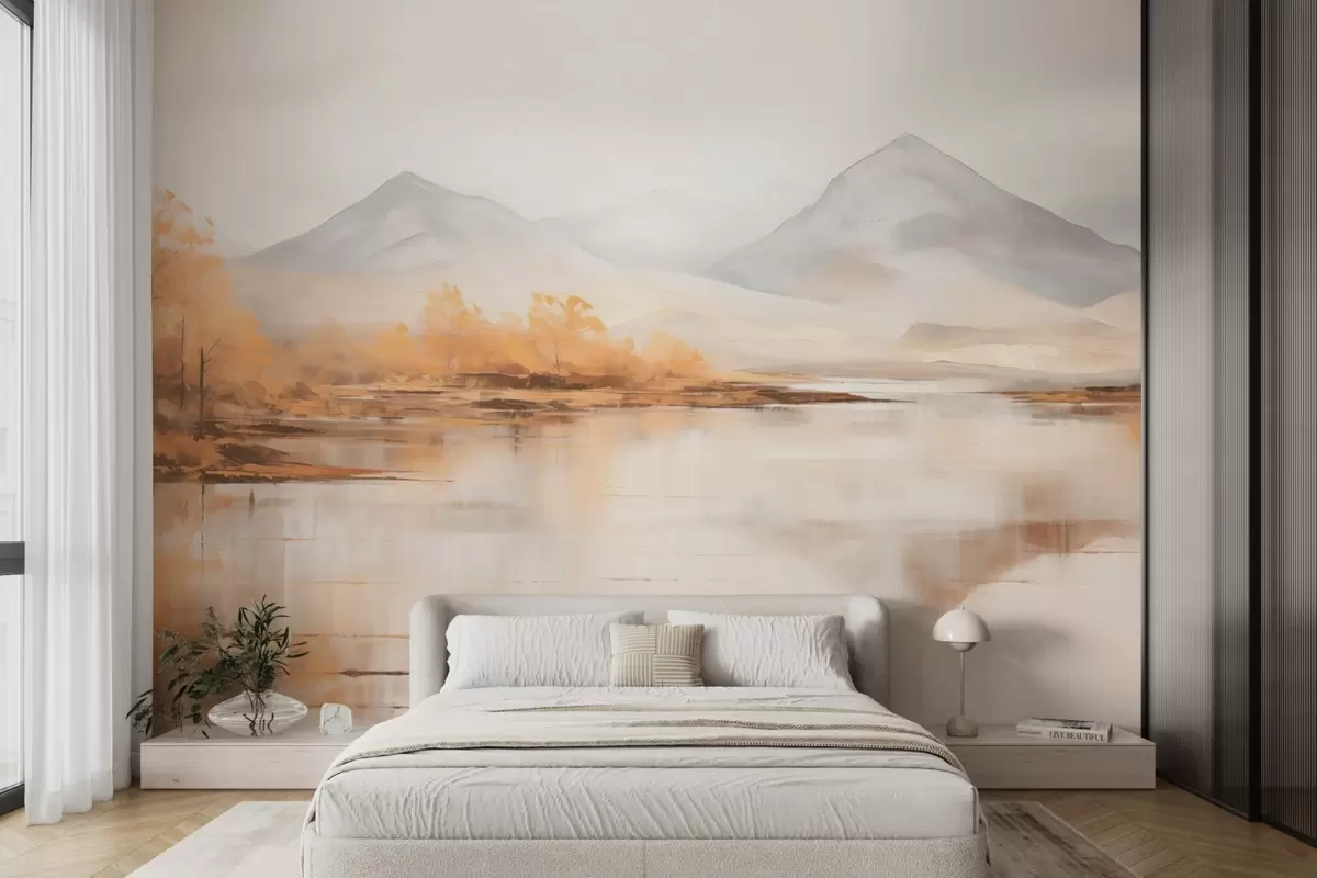 Carta da parati Paesaggio autunnale con alberi gialli e un fiume sullo sfondo di una montagna nr. w09020