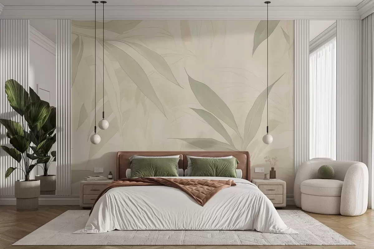 Carta da parati Rami con foglie dai toni verdi tenui su uno sfondo beige nr. w09027