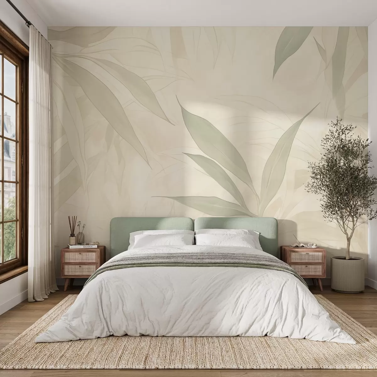 Carta da parati Rami con foglie dai toni verdi tenui su uno sfondo beige nr. w09027