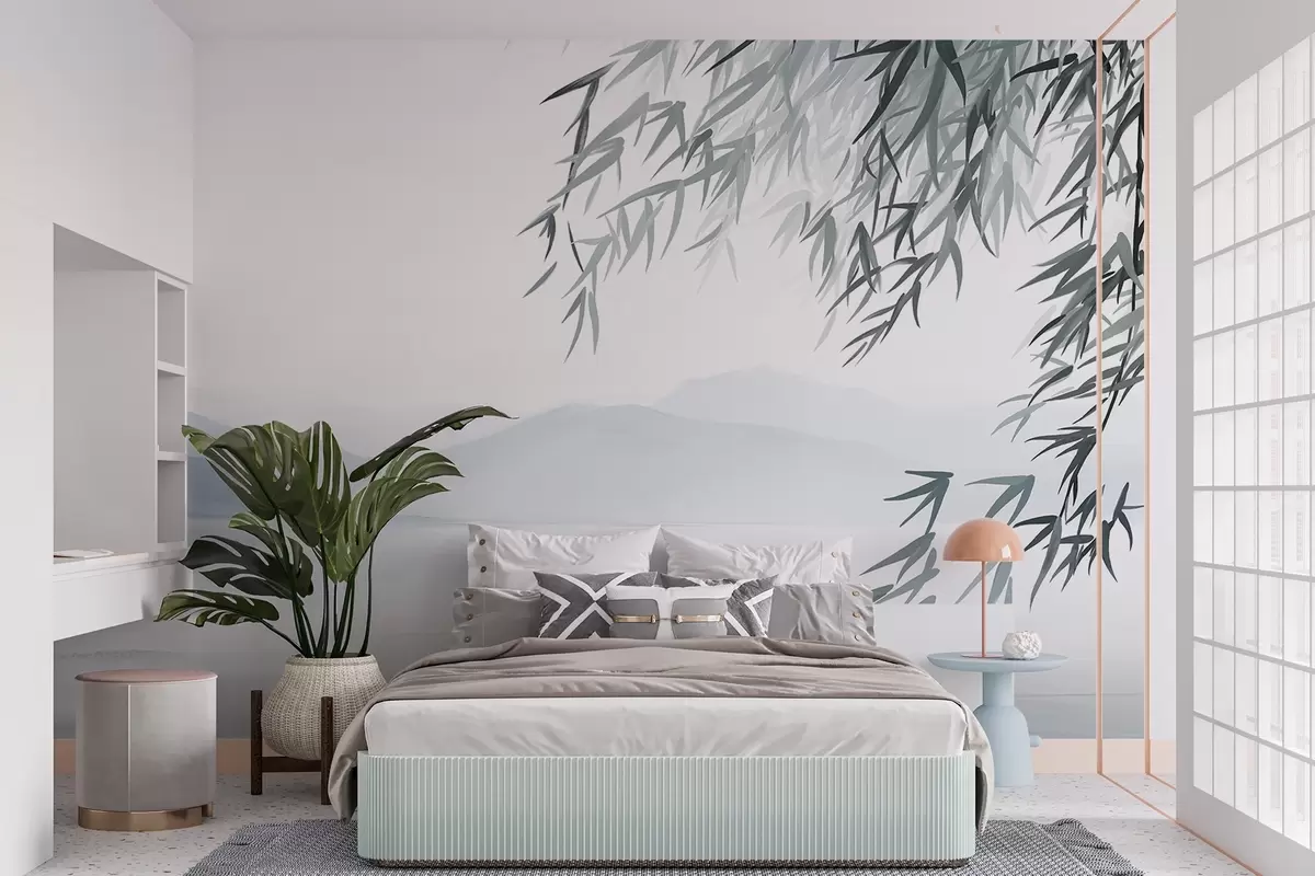 Carta da parati Foglie di bambù sospese su un lago con montagne sullo sfondo, toni tenui del blu e del bianco, stile pittura con lavaggio a inchiostro nr. w09048