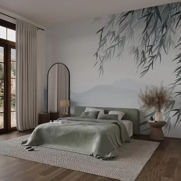 Carta da parati Foglie di bambù sospese su un lago con montagne sullo sfondo, toni tenui del blu e del bianco, stile pittura con lavaggio a inchiostro nr. w09048
