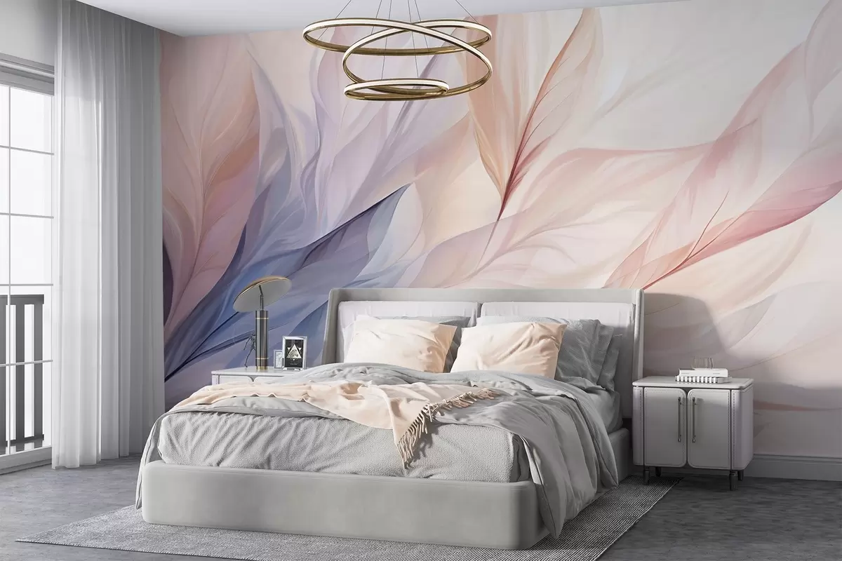Carta da parati Disegno floreale astratto con petali fluenti in tonalità pastello di rosa, pesca e blu, che creano una composizione morbida e sognante nr. w09049