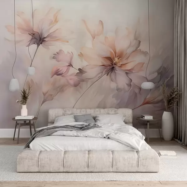 Carta da parati Una delicata arte floreale con grandi fiori color pastello dai petali traslucidi, steli morbidi e uno sfondo delicatamente diffuso nr. w09050