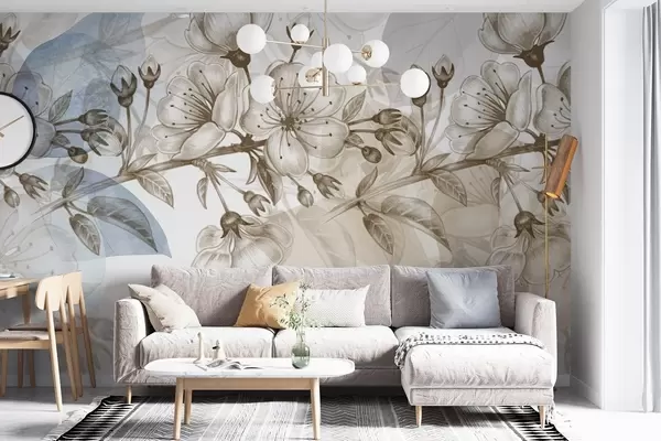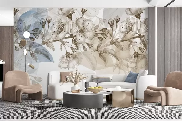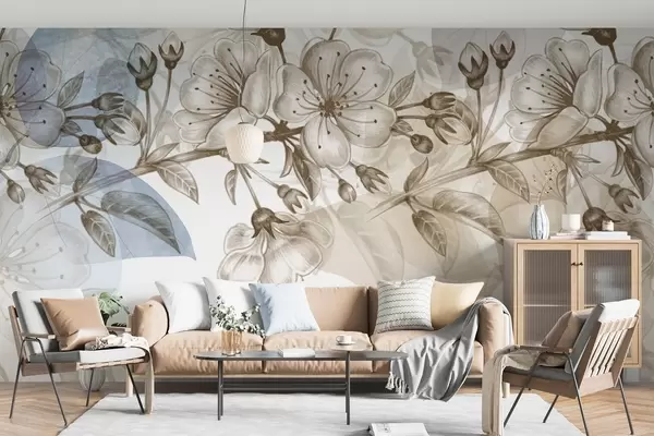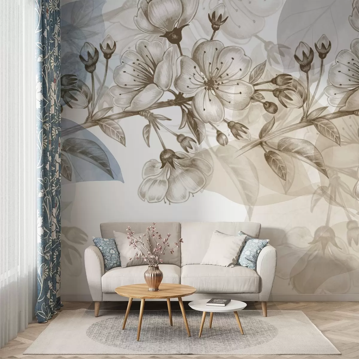 Carta da parati Ramo di ciliegio in fiore con fiori e boccioli, toni seppia, sfondo morbido simile ad un acquerello con sfumature blu e marroni nr. w09051