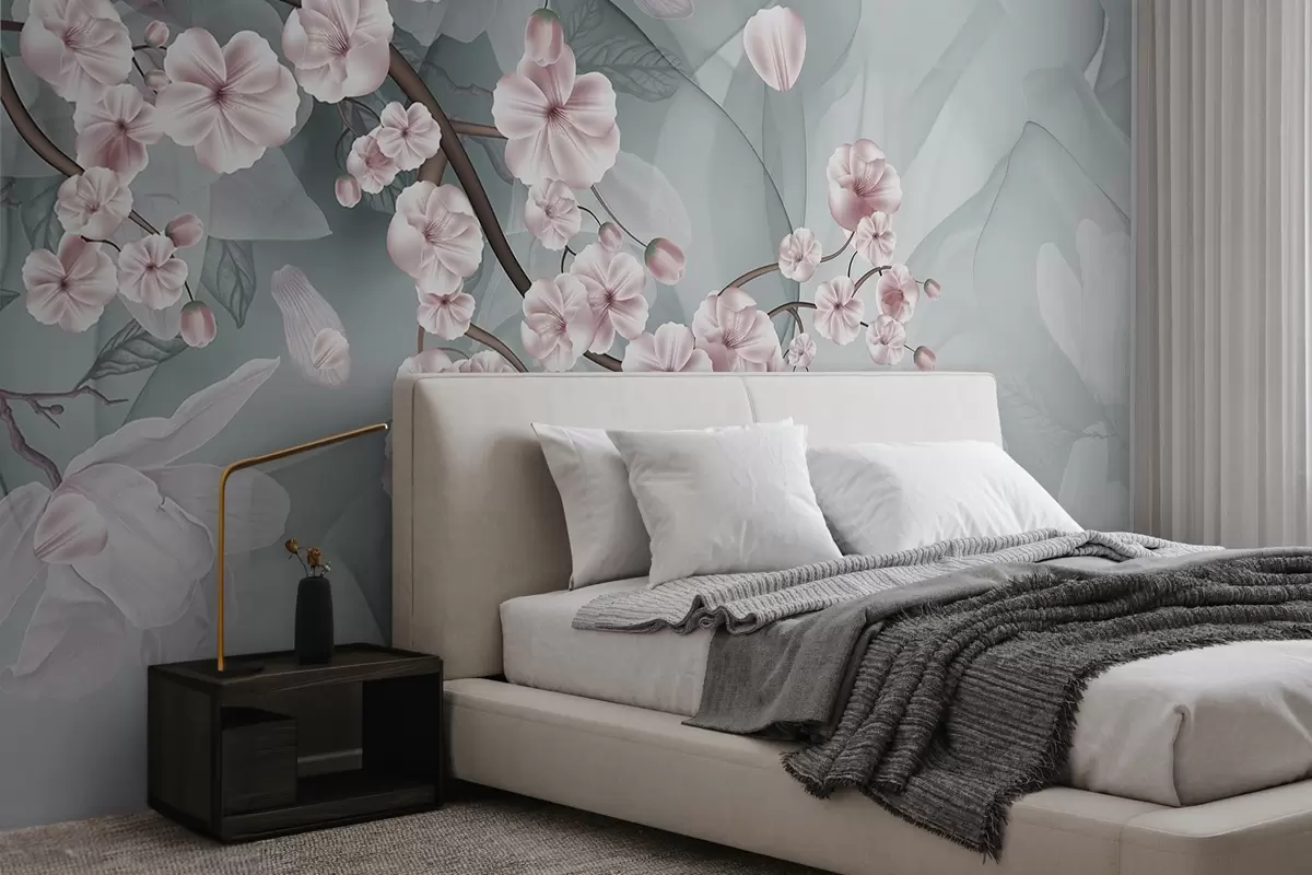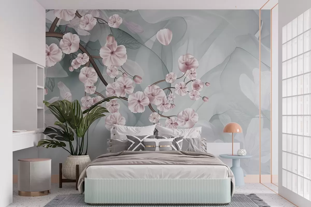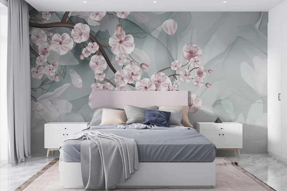Carta da parati Rami di fiori di ciliegio con fiori e petali rosa, rami marroni, sfondo astratto mutevole con effetto fluido nr. w09054