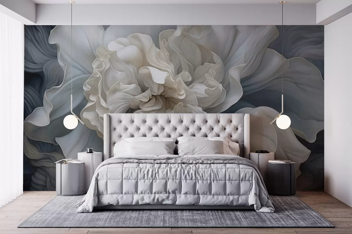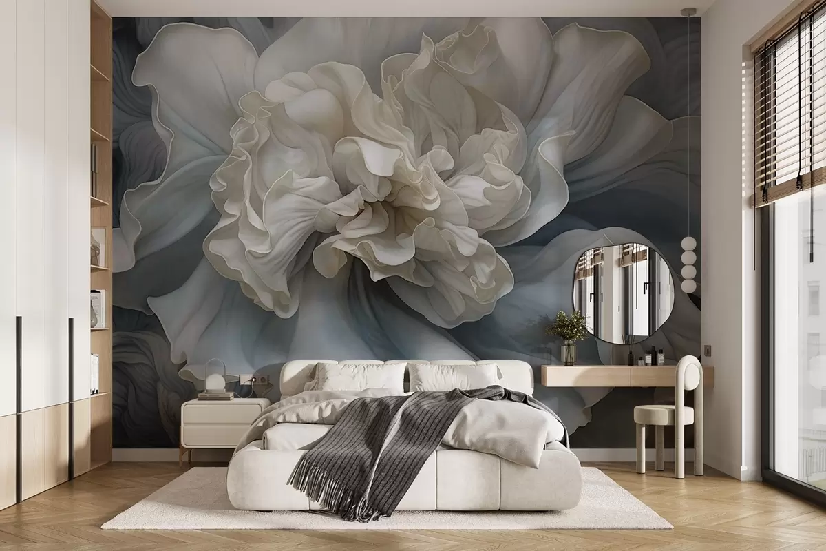 Carta da parati Fiore decorativo astratto di grandi dimensioni con molti petali, morbido e delicato, con sfumature blu e grigie sullo sfondo nr. w09055