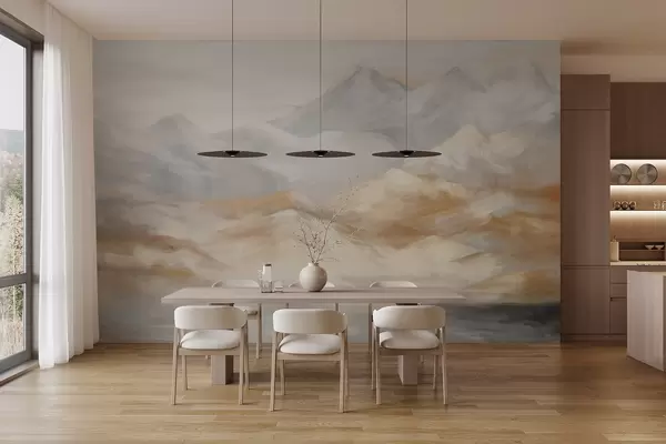 Carta da parati Paesaggio strutturato con montagne e lago in primo piano, nei toni del bianco, del grigio e del marrone nr. w09057