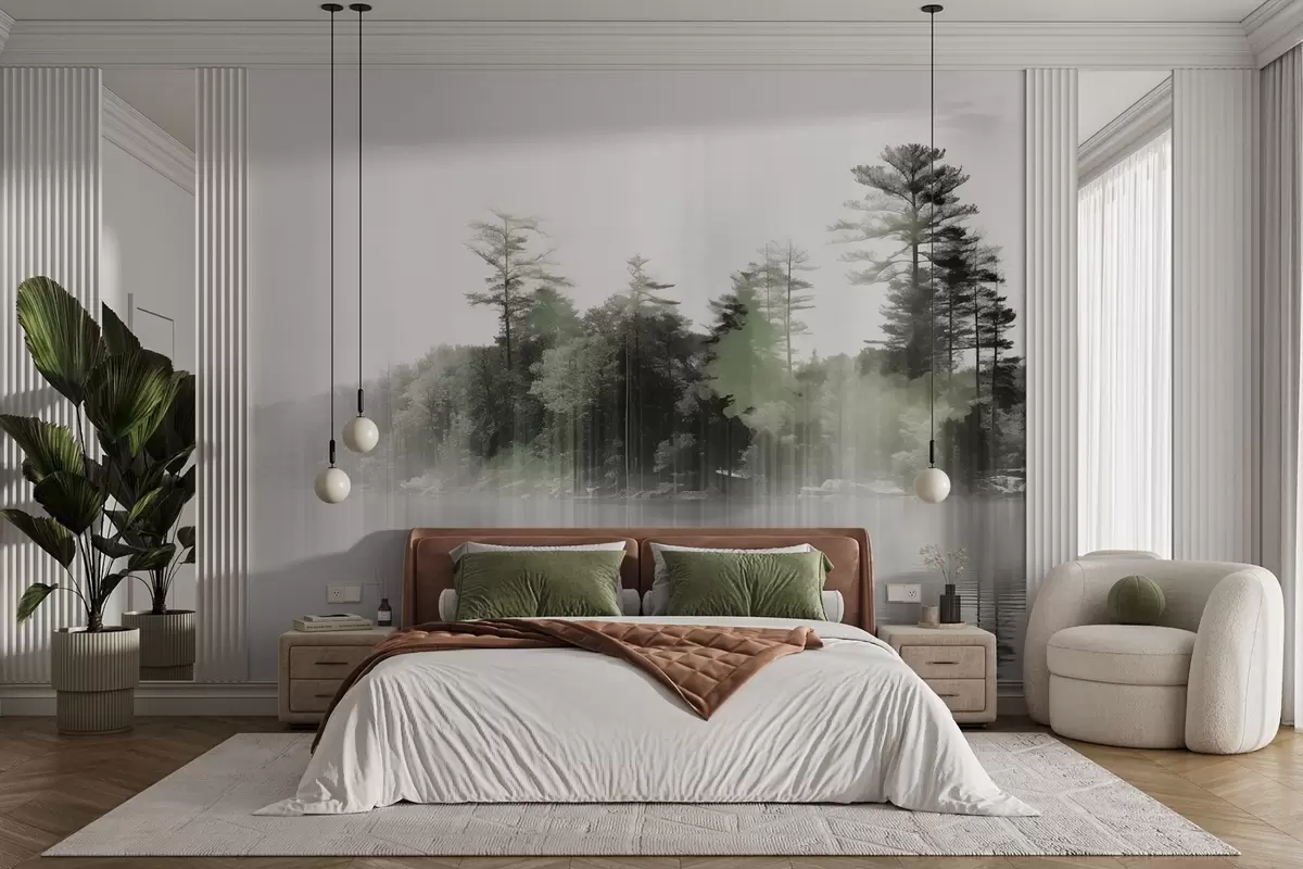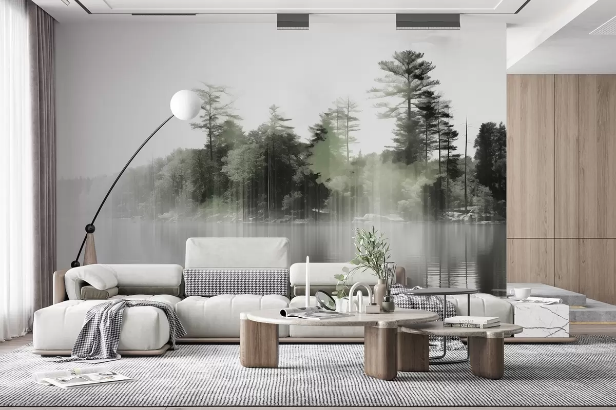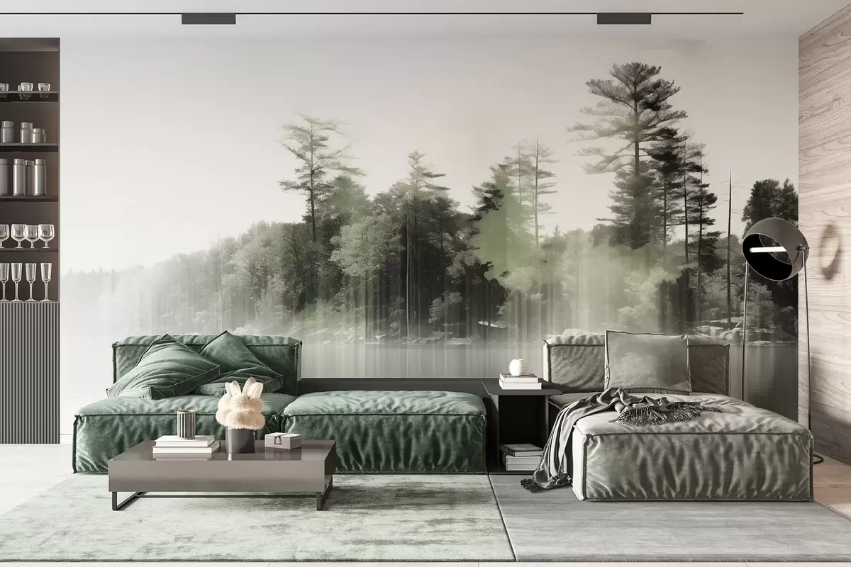 Carta da parati Paesaggio astratto minimalista strutturato con un lago e alberi riflessi nell'acqua in tonalità verde e bianco nr. w09058