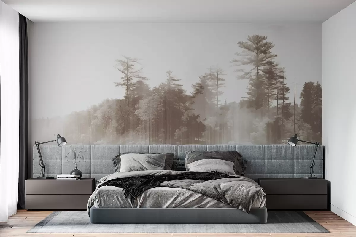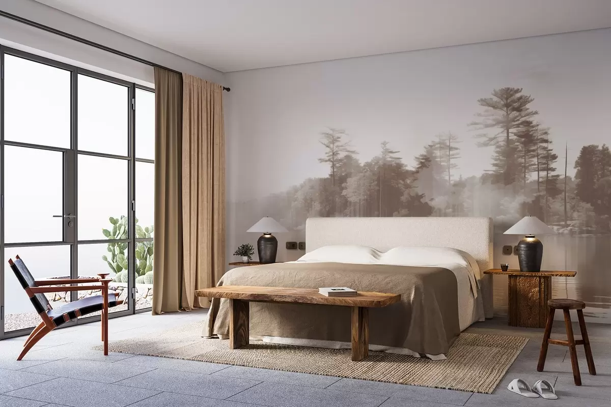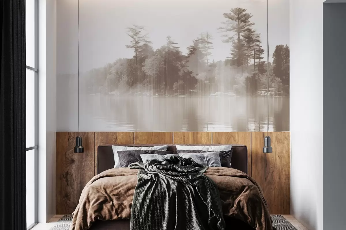 Carta da parati Paesaggio astratto e minimalista con un lago e alberi che si riflettono nell'acqua nei toni del beige e del bianco nr. w09058v1