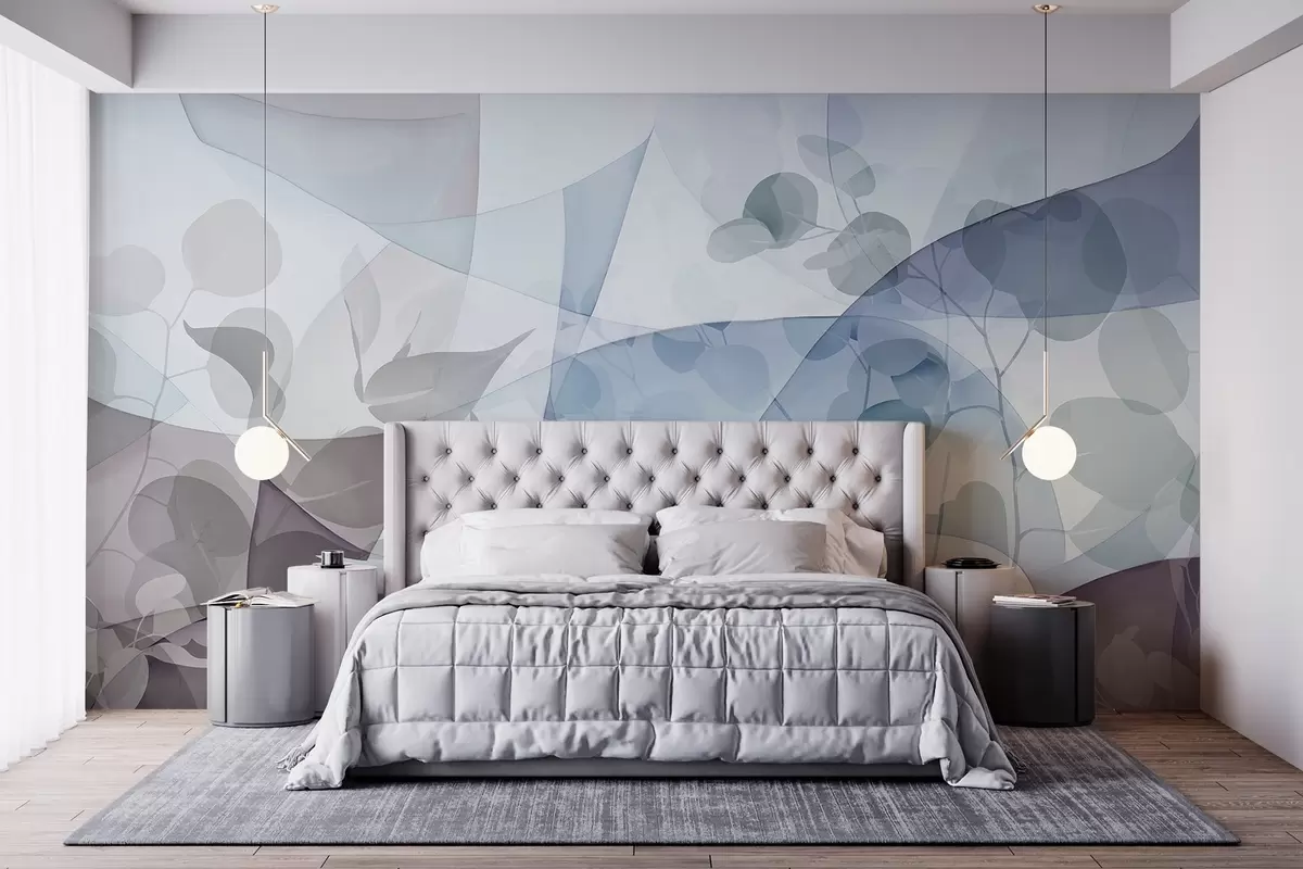 Carta da parati Illustrazione botanica astratta con foglie di eucalipto e forme geometriche in colori tenui di blu, marrone e bianco nr. w09061