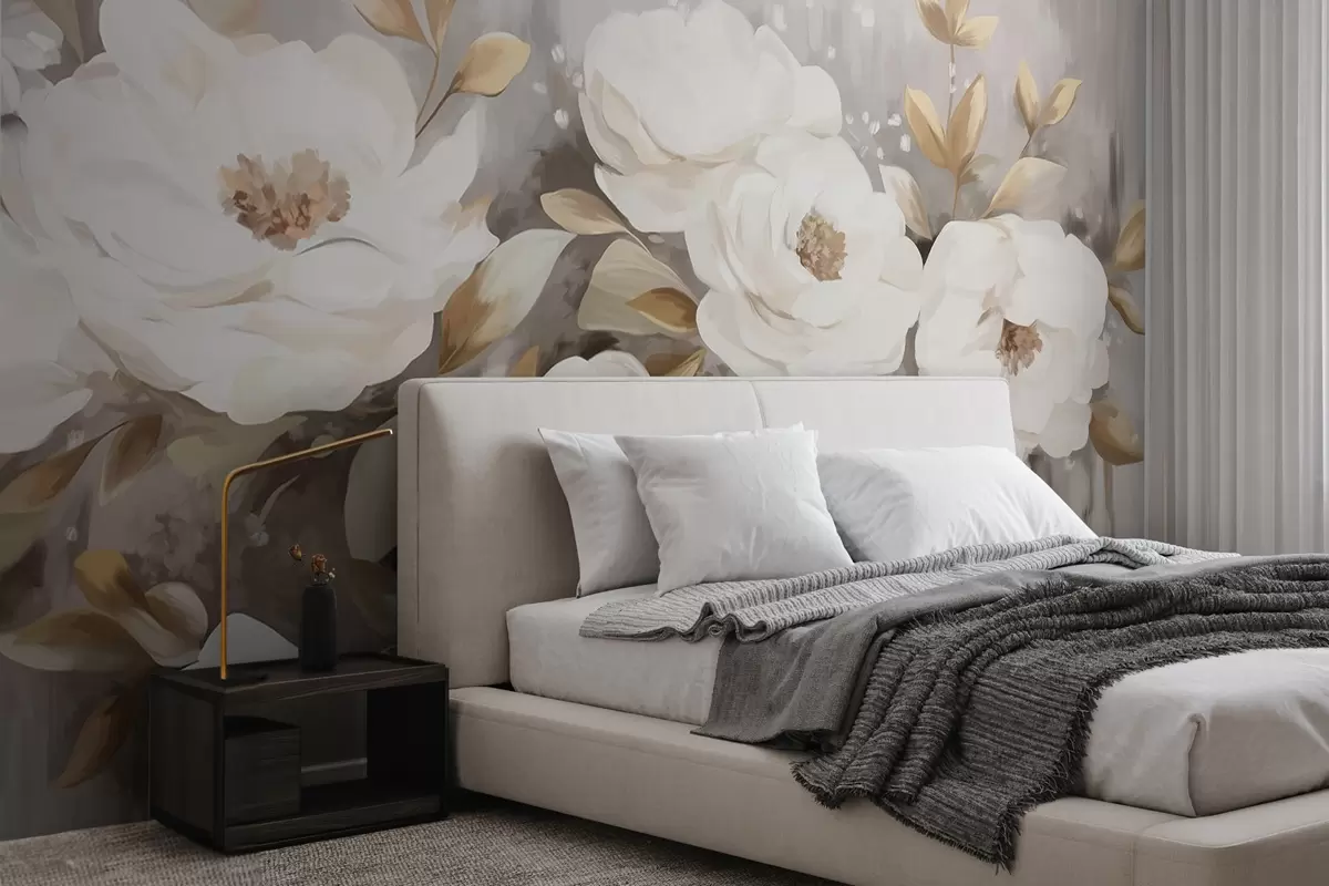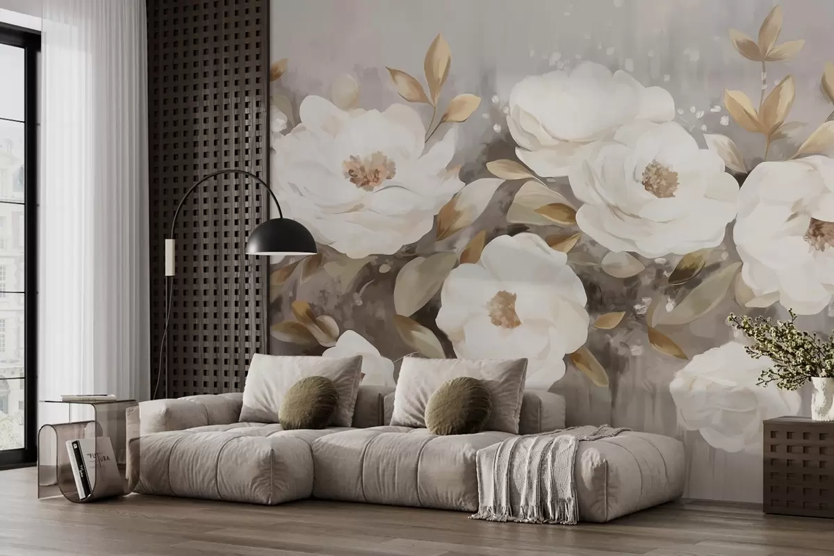 Carta da parati Fiori bianchi con foglie gialle, petali morbidi, composizione floreale delicata, tavolozza di colori neutri, pennellate strutturate nr. w09062