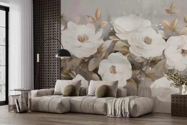 Carta da parati Fiori bianchi con foglie gialle, petali morbidi, composizione floreale delicata, tavolozza di colori neutri, pennellate strutturate nr. w09062